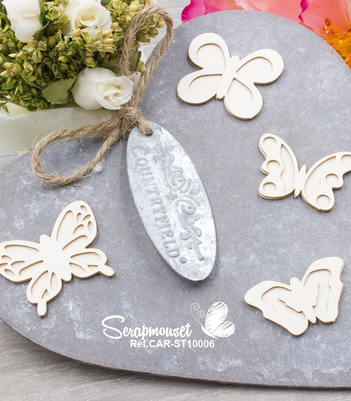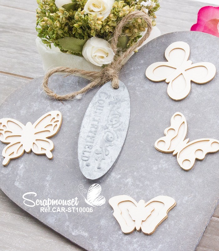 Ces papillons en carton bois de 0,7 mm d'épaisseur sont présentés sur une planche mesurant 10 cm x 15 cm. vous pourrez superposer le papillon ajouré sur le papillon plein pour donner un beau volume. Vous obtiendrez superbes embellissements 2D.