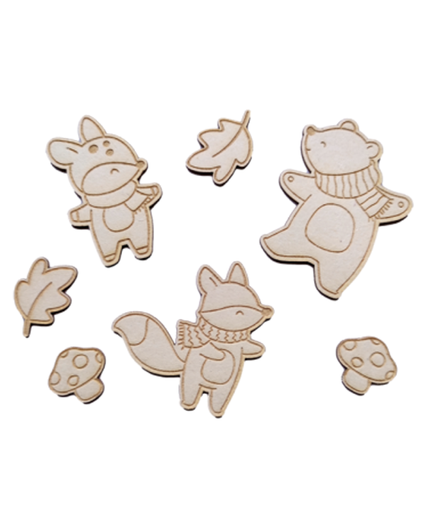 Ensemble de 7 petits embellissements sur le thème de la forêt en carton bois fabriqués artisanalement dans notre atelier en France.