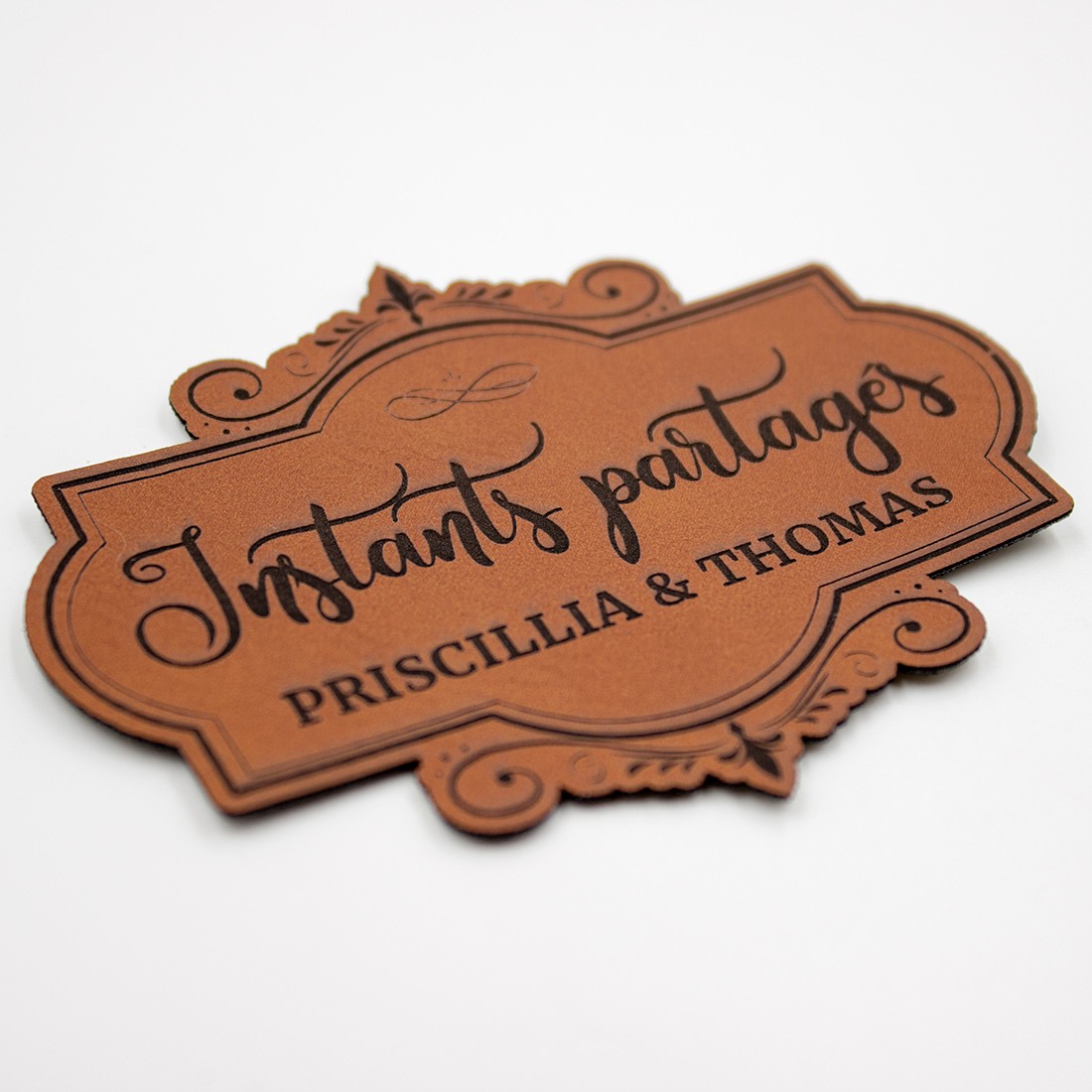 Étiquette en cuir synthétique de qualité supérieure avec le mot Instants partagés à personnaliser par l'ajout d'un ou deux prénoms.
